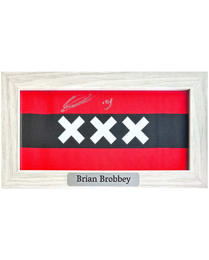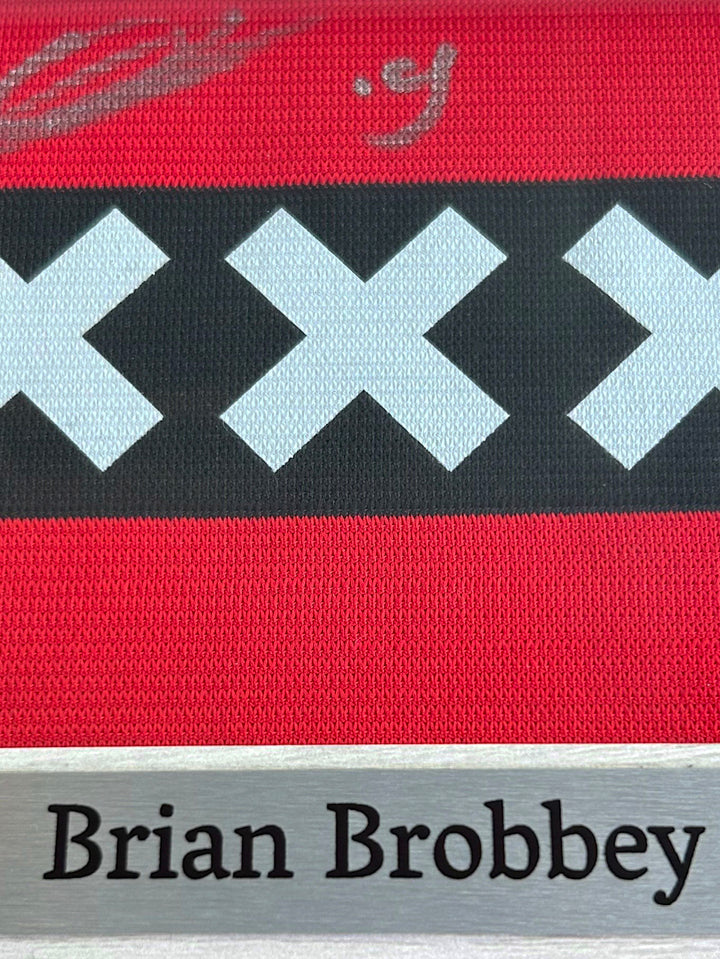 🖼️ Ingelijst geleverd: Deze Ajax aanvoerdersband met signatie van Brobbey wordt ingelijst geleverd met onze hoogwaardige kwaliteit lijsten!