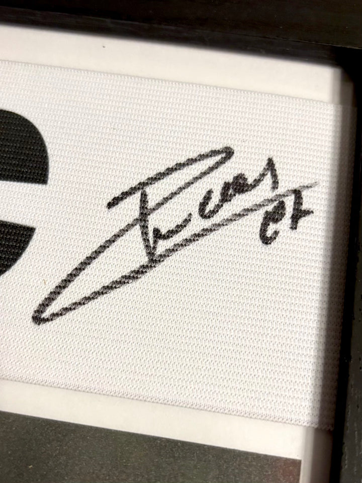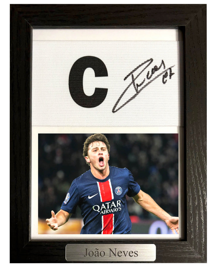 De aanvoerdersband wordt ingelijst met één van onze twee inlijst methodes naar keuze! Bij de eerste methode (de standaardmethode zoals op de eerste productfoto), wordt het item ingelijst geleverd met een foto van João Neves, en een lux zilver of goud naamplaatje!