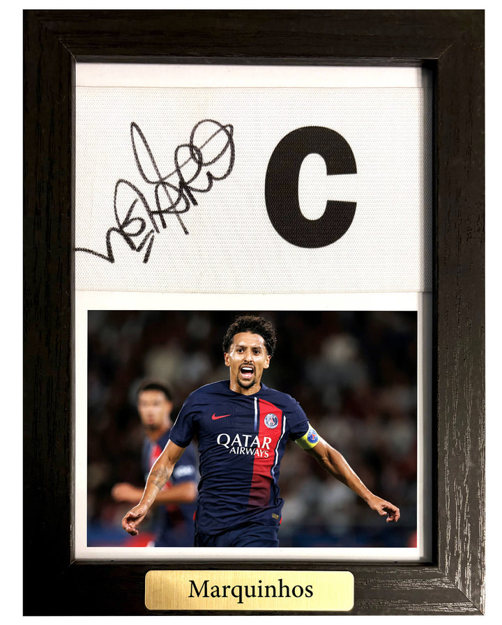 🖼️ Ingelijst geleverd: Deze aanvoerdersband met signatie van Marquinhos wordt ingelijst geleverd met onze hoogwaardige kwaliteit lijsten!