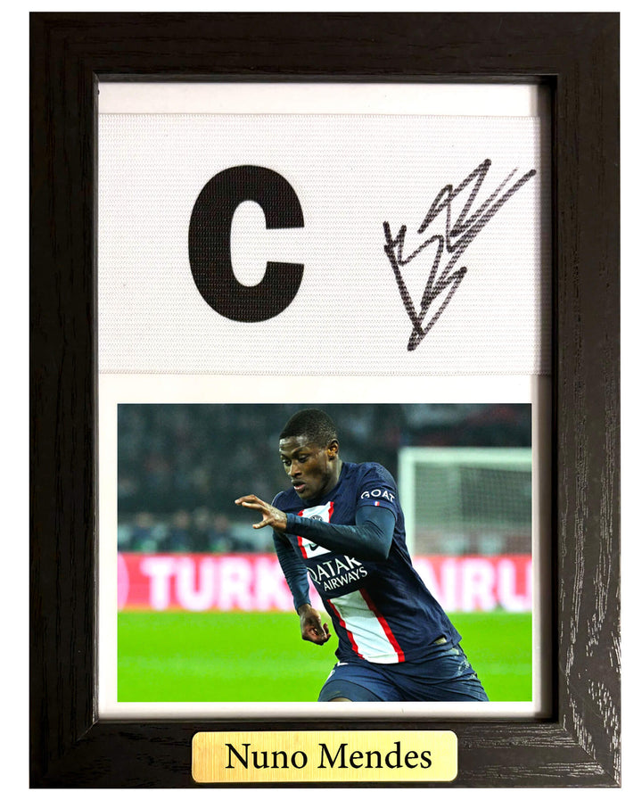 🖼️ Ingelijst geleverd: Deze aanvoerdersband met signatie van Nuno Mendes wordt ingelijst geleverd met onze hoogwaardige kwaliteit lijsten!