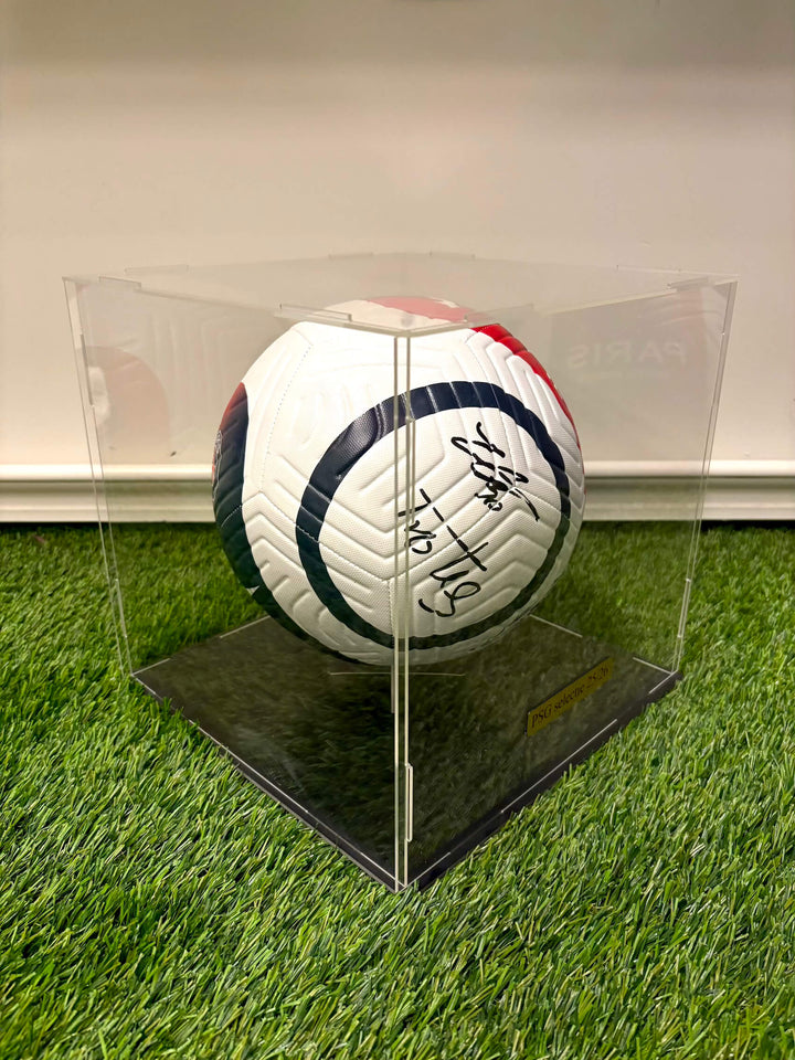🖼️ Inlijsting opties: Omdat wij een stukje gratis service willen bieden, zodat jouw gesigneerde items meteen klaar zijn om een uniek plekje te krijgen, geven we zoals we bij shirts gratis inlijsting bieden, bij gesigneerde voetballen een gratis zwarte balhouder! Wil jij toch iets met een luxere uitstraling? Dan kun je tegen een extra vergoeding kiezen voor de doorzichtige balhouder, of zelfs voor de luxe box! Bij de luxe balbox is er ook een lux naamplaatje die op de box bevestigd zit, met de naam van de speler door wie deze bal gesigneerd is!