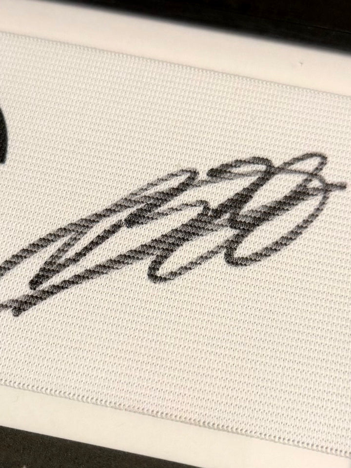 De aanvoerdersband wordt ingelijst met één van onze twee inlijst methodes naar keuze! Bij de eerste methode (de standaardmethode zoals op de eerste productfoto), wordt het item ingelijst geleverd met een foto van Bilal El Khannouss, en een lux zilver of goud naamplaatje!