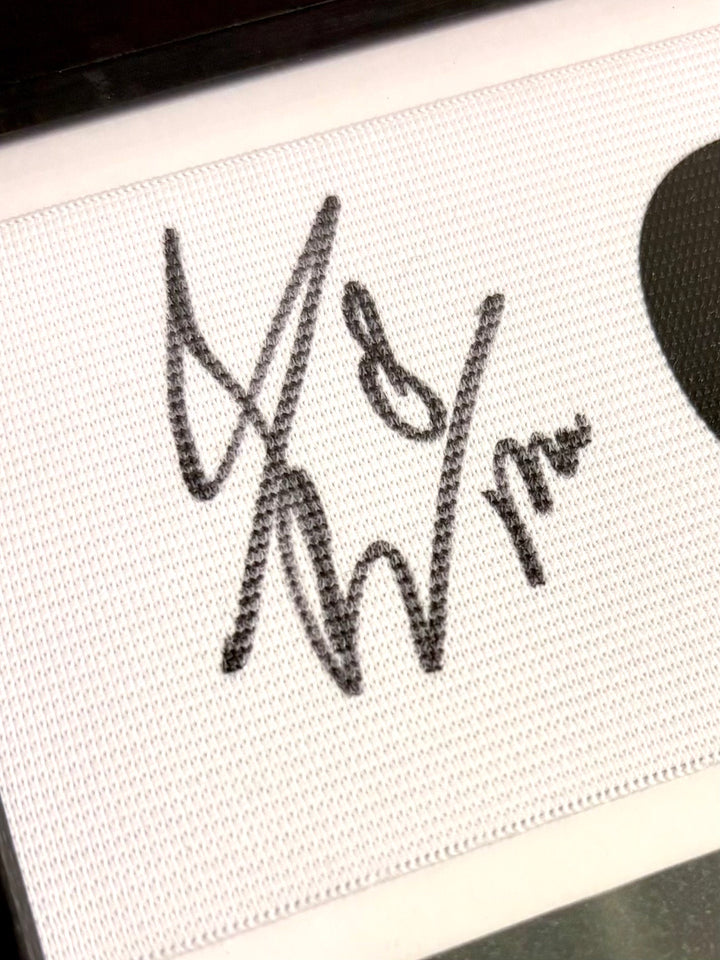 De aanvoerdersband wordt ingelijst met één van onze twee inlijst methodes naar keuze! Bij de eerste methode (de standaardmethode zoals op de eerste productfoto), wordt het item ingelijst geleverd met een foto van Karim El Ahmadi, en een lux zilver of goud naamplaatje!