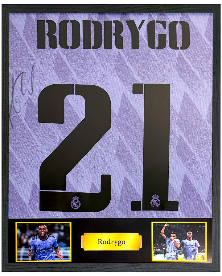 🖼️ Ingelijst geleverd: Dit shirt met signatie van Rodrygo, wordt ingelijst geleverd met onze nieuwe, premium kwaliteit lijsten. Nu met steviger hout langs de zijkanten en een modern design, gecombineerd met zeer helder glas. Het shirt wordt ingelijst met twee foto's en een naamkaartje, zoals op de afbeelding. Direct klaar om opgehangen te worden tussen jouw unieke collectie of in je ruimte! Een elegante uitstraling en klaar om bewonderd te worden!